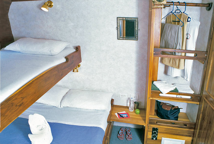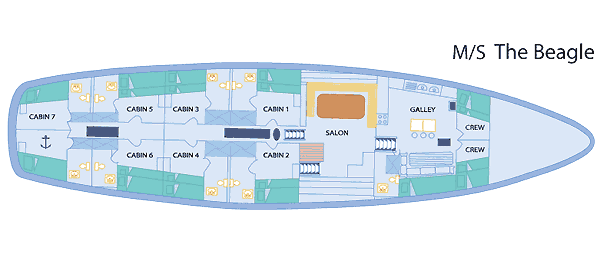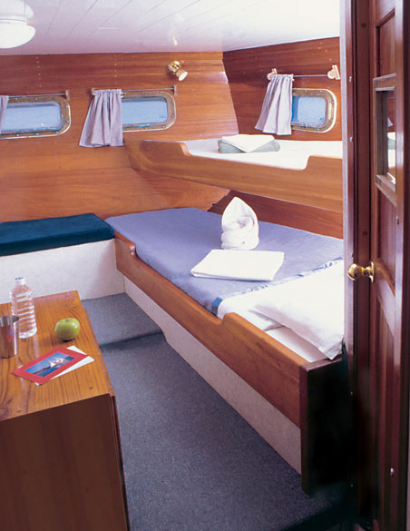 Sistemazione: 14 passeggeri in 6 cabine doppie ed una cabina doppia più piccola, con aria condizionata e bagno privato. Tutte le cabine hanno un letto superiore singolo ed un letto inferiore da una piazza e mezza, ad eccezione dalla cabina 7 che ha due cuccette singole. Il motoveliero dispone di un’accogliente sala da pranzo, una zona pranzo di coperta, un gommone e due kayak da due persone per le escursioni.