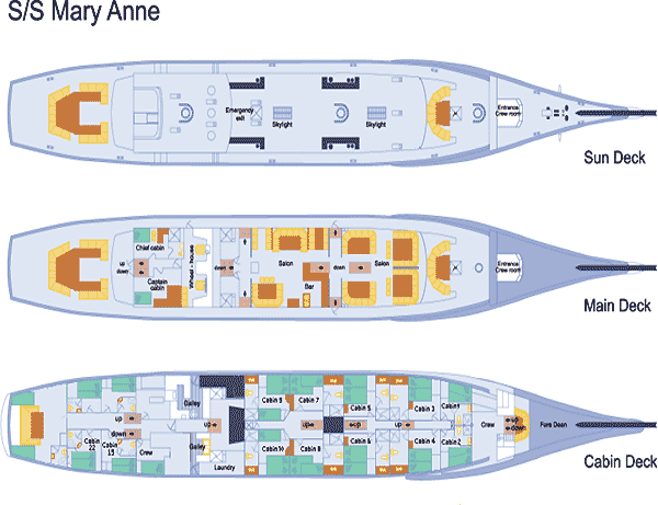 Costruita nel 1997 seguendo tutte le norme per la conservazione della natura, la Mary Anne è stata certificata con il marchio SMART VOYAGER per il suo alto livello di rispetto delle regole ambientali.