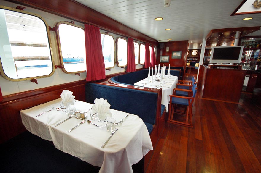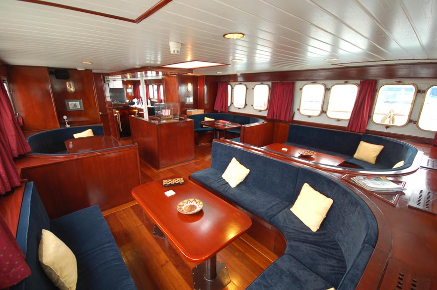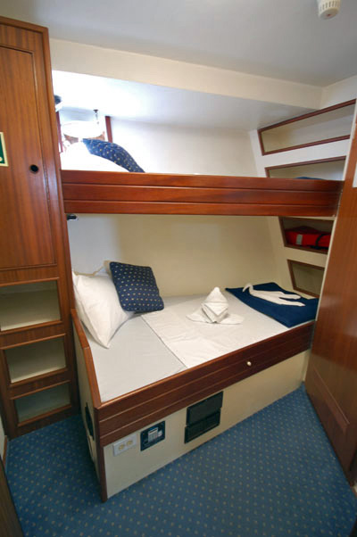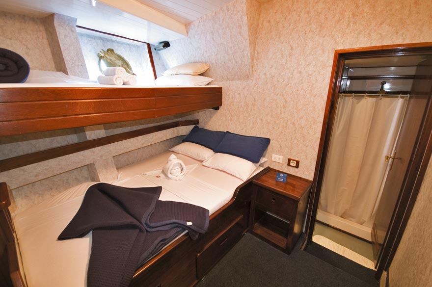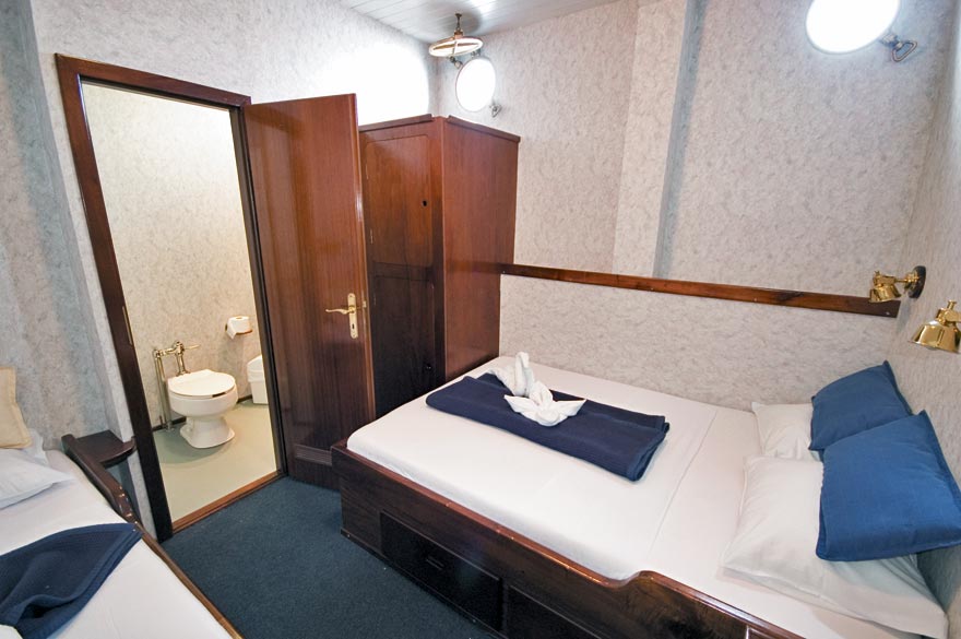 Sistemazione: un massimo di 24 passeggeri distribuiti in 12 cabine con bagno privato ed aria condizionata. Le cabine sono suddivise in: Traditional (cabine 1, 2, 19 e 22), Standard (cabine 3-6) e Superior (cabine 7-10). I servizi includono un comodo salone con pannelli in legno, un’accogliente zona bar, una biblioteca, delle zone di coperta per prendere il sole, alcuni kayak ed un proprio impianto di potabilizzazione dell’acqua.