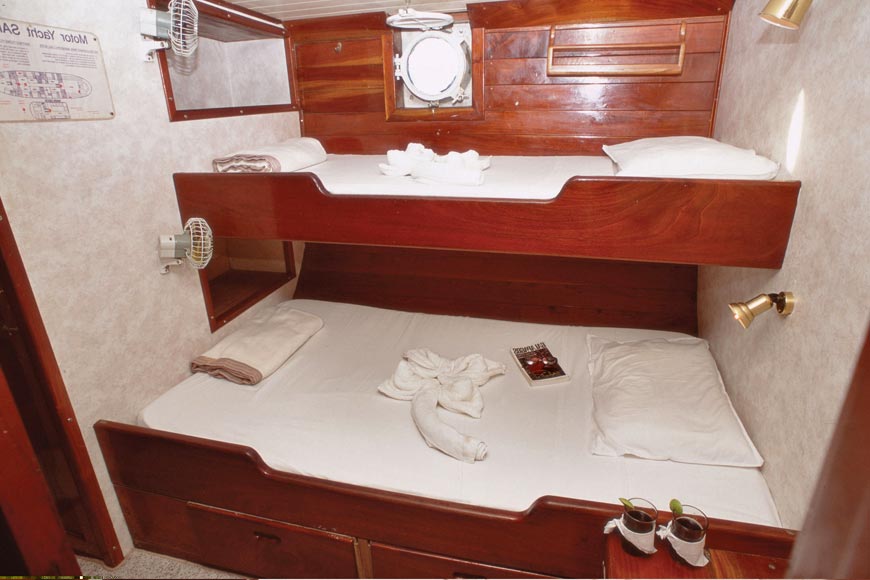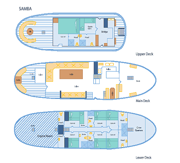 Sistemazione: Le 6 cabine sul ponte inferiore hanno letti a castello, con il letto inferiore da 1 piazza e mezza. La cabina n. 7 sul ponte superiore ha un letto matrimoniale. Tutte dispongono di bagno privato ed aria condizionata. La Samba dispone di un comodo salone interno ed un’attraente zona pranzo esterna, un piccolo bar, televisione a colori e lettore DVD, mini-biblioteca con libri e DVD, due gommoni a motore.